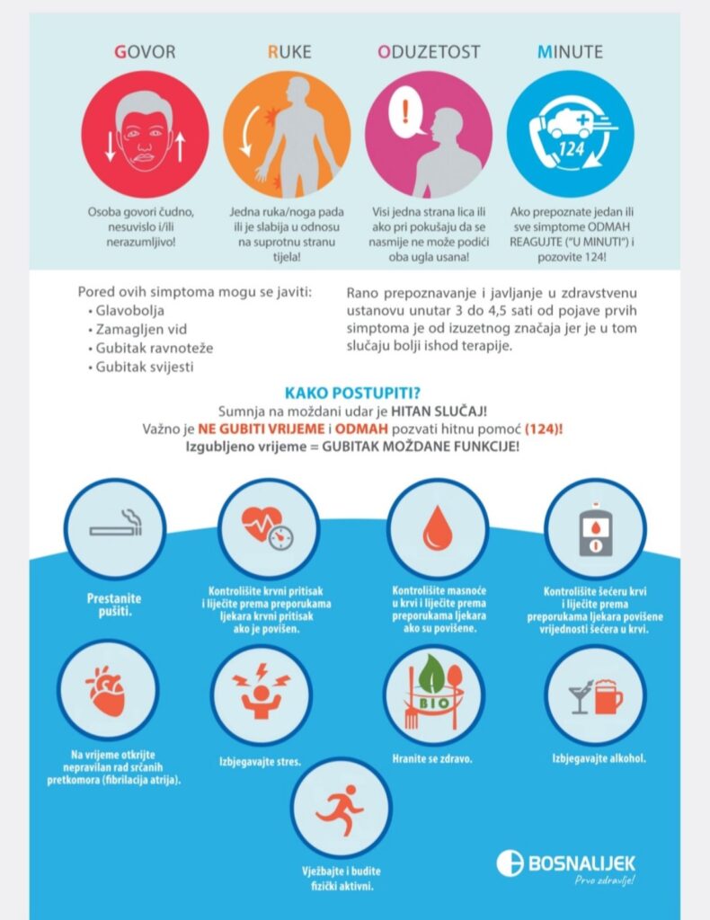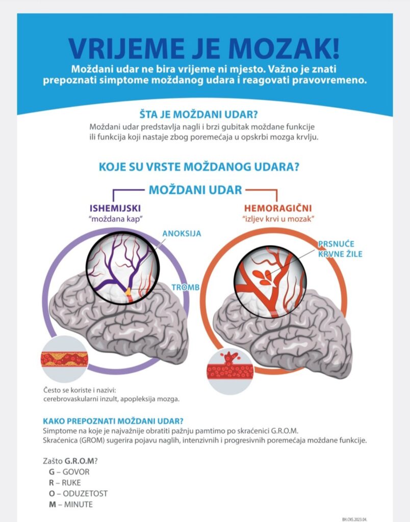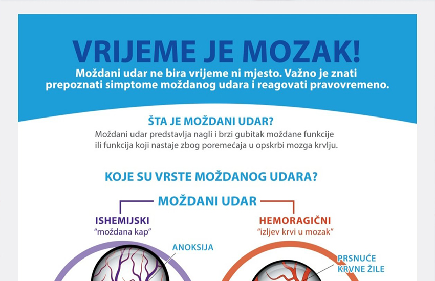 Također, ovim povodom će biti najavljena javna kampanju za građane “Vrijeme je mozak”, a koja se odnosi na trombolitičku terapiju, koja se može dati unutar četiri i po sata od ranih znakova moždanog udara. Terapija se može dati samo unutar tog vremenskog perioda i zbog toga je presudno da osoba na vrijeme prepozna simptome i odmah dođe u zdravstvenu ustanovu.